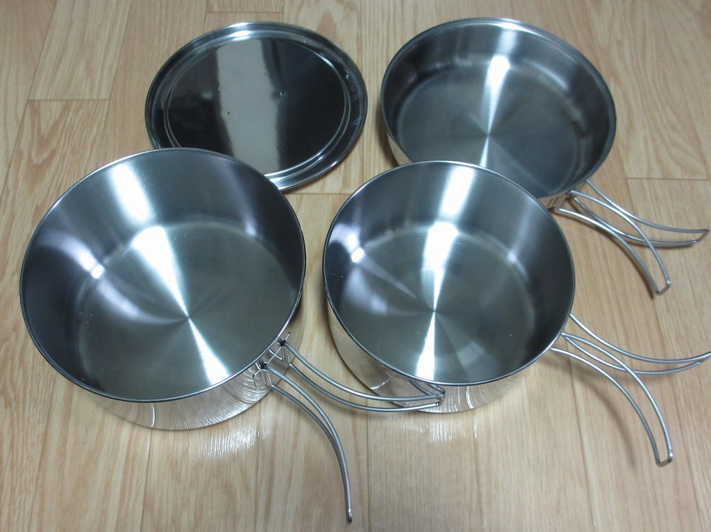 鍋2つ、フライパン、フタ、メッシュ収納袋があり、取ってを折りたたむ事が出来ます。