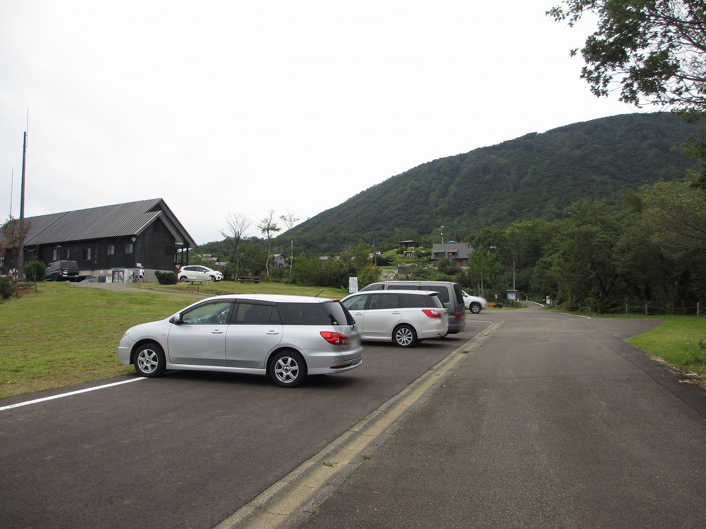 駐車場はキャンプ場のロッジ前にあり、奥の登山口手前にはトイレがあります。
