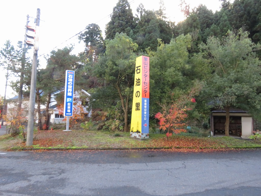 鳥居をくぐり、道路を左側に進むと右側に石油の世界館、左側に里山ビジターセンターが見えてきます。