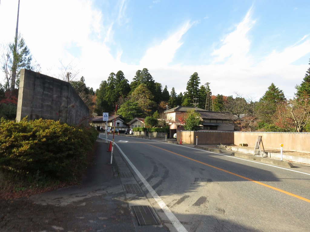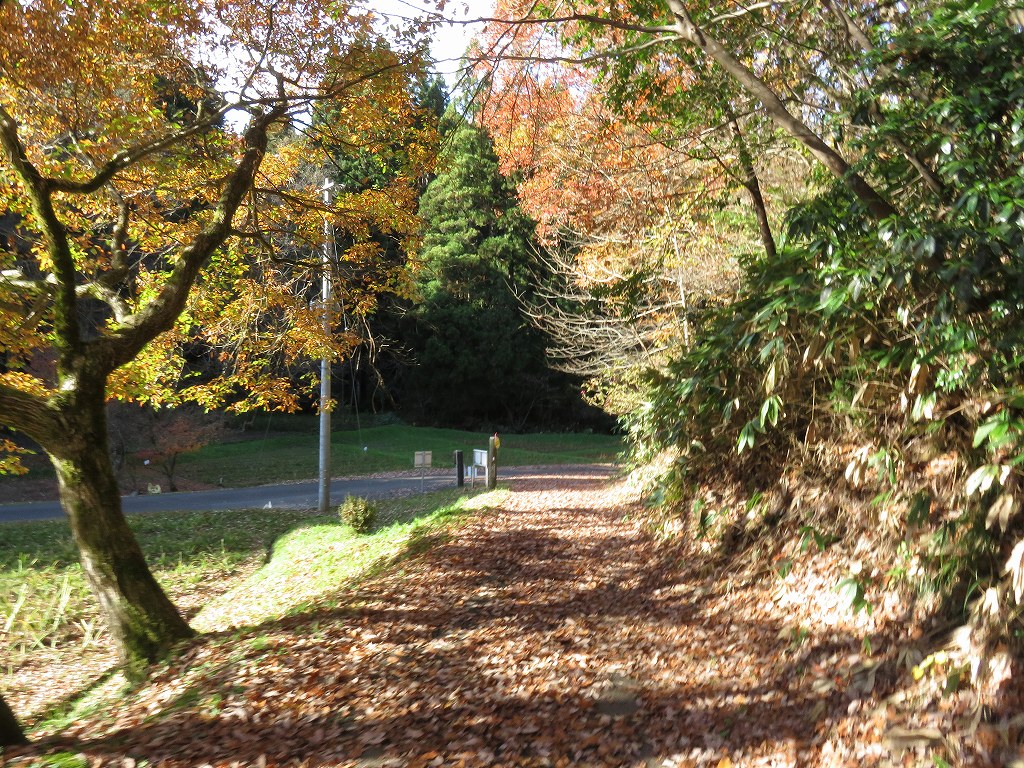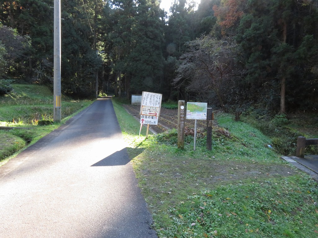 平坦な箇所や緩やかな下り歩くと、道路と合流するので左に行くと、石油の里方面と白玉の滝の分岐路があります。