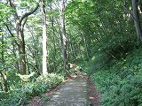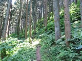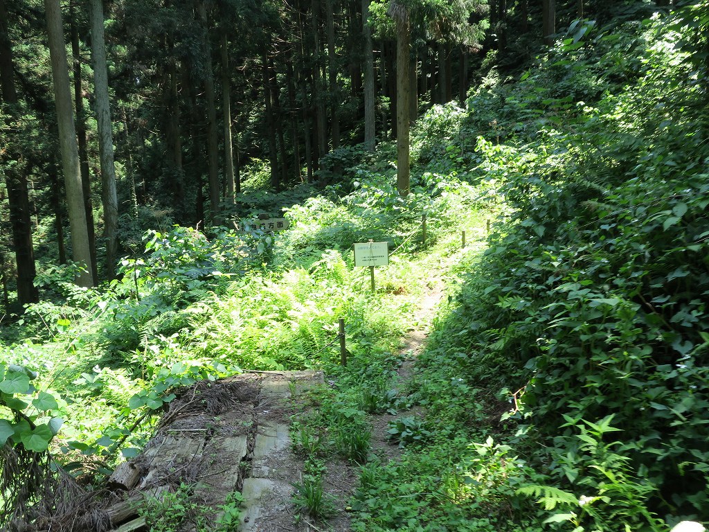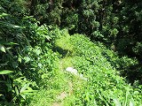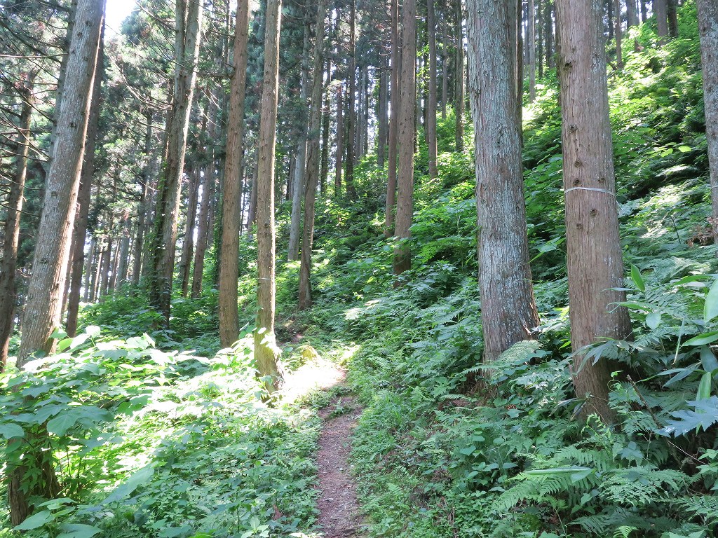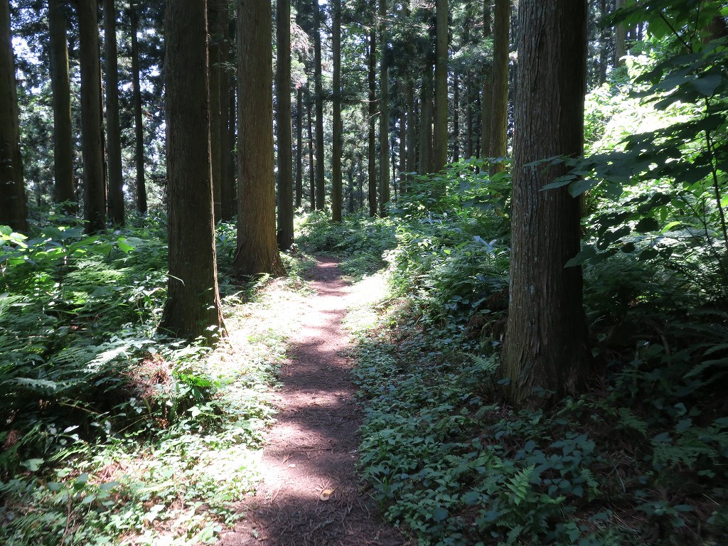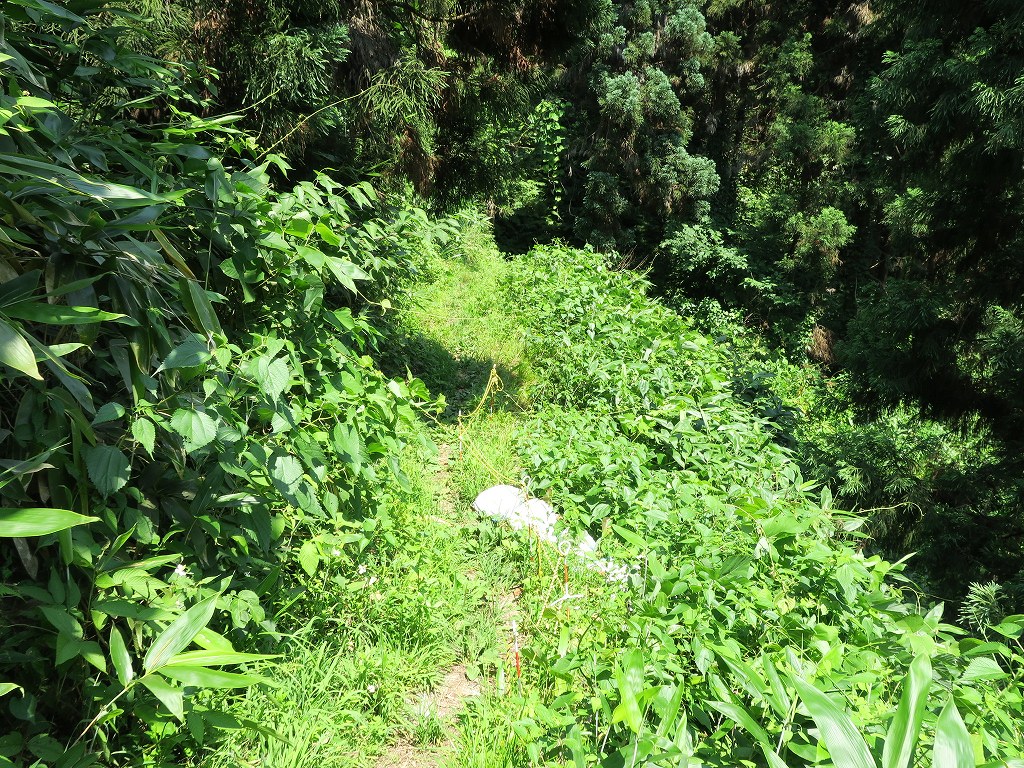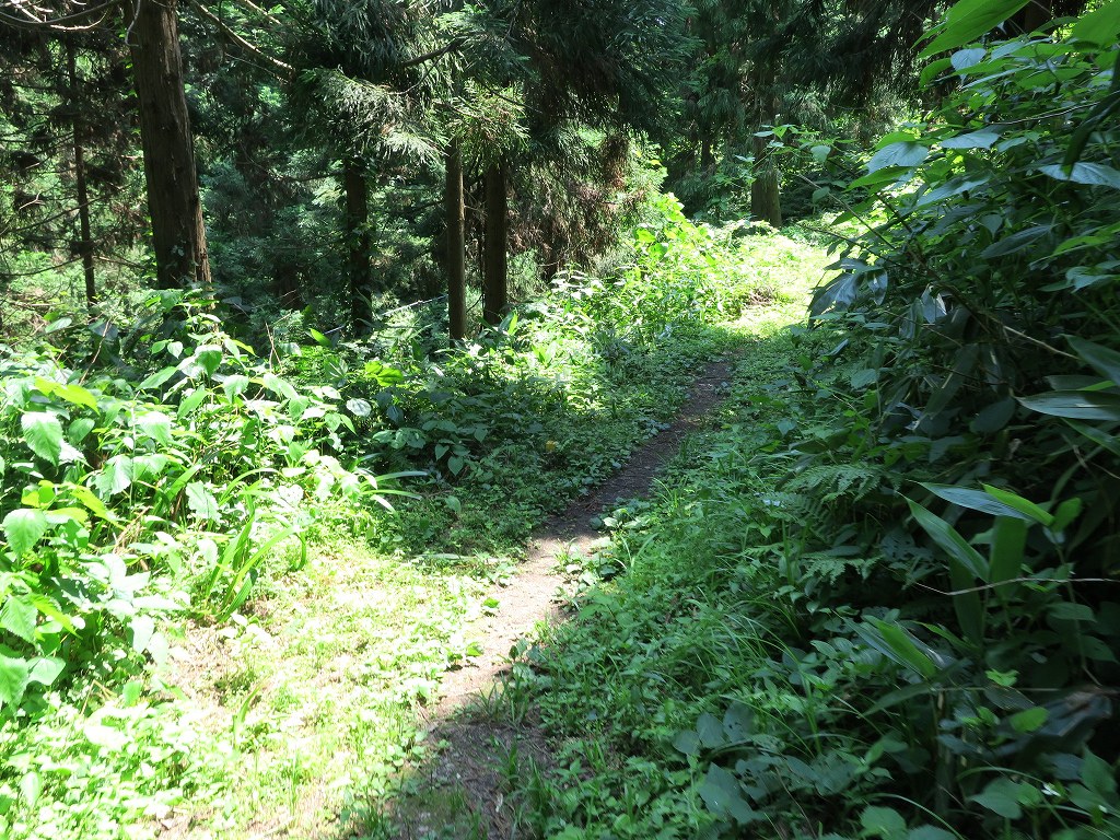 ここからは、草木が生い茂る山道となり、緩い下りが続きます。