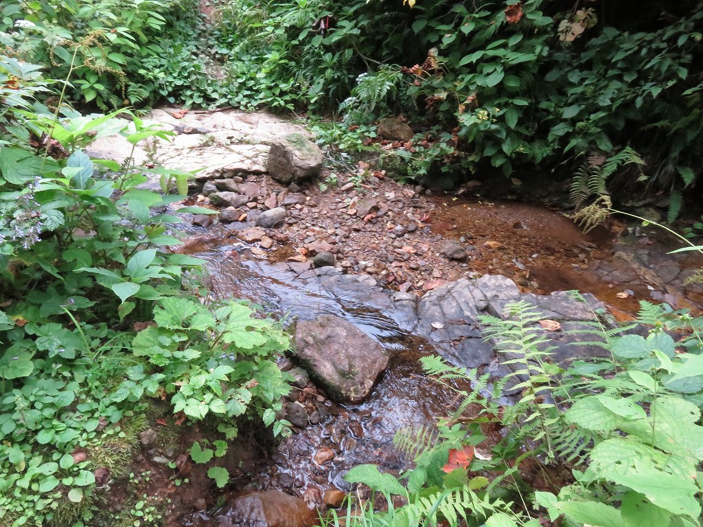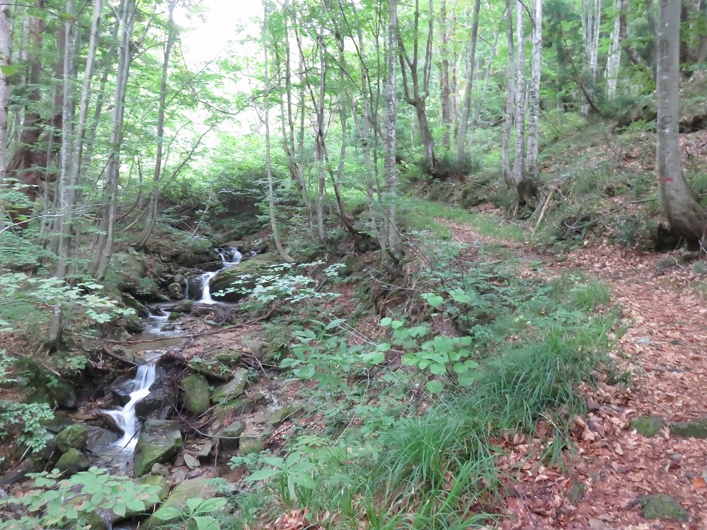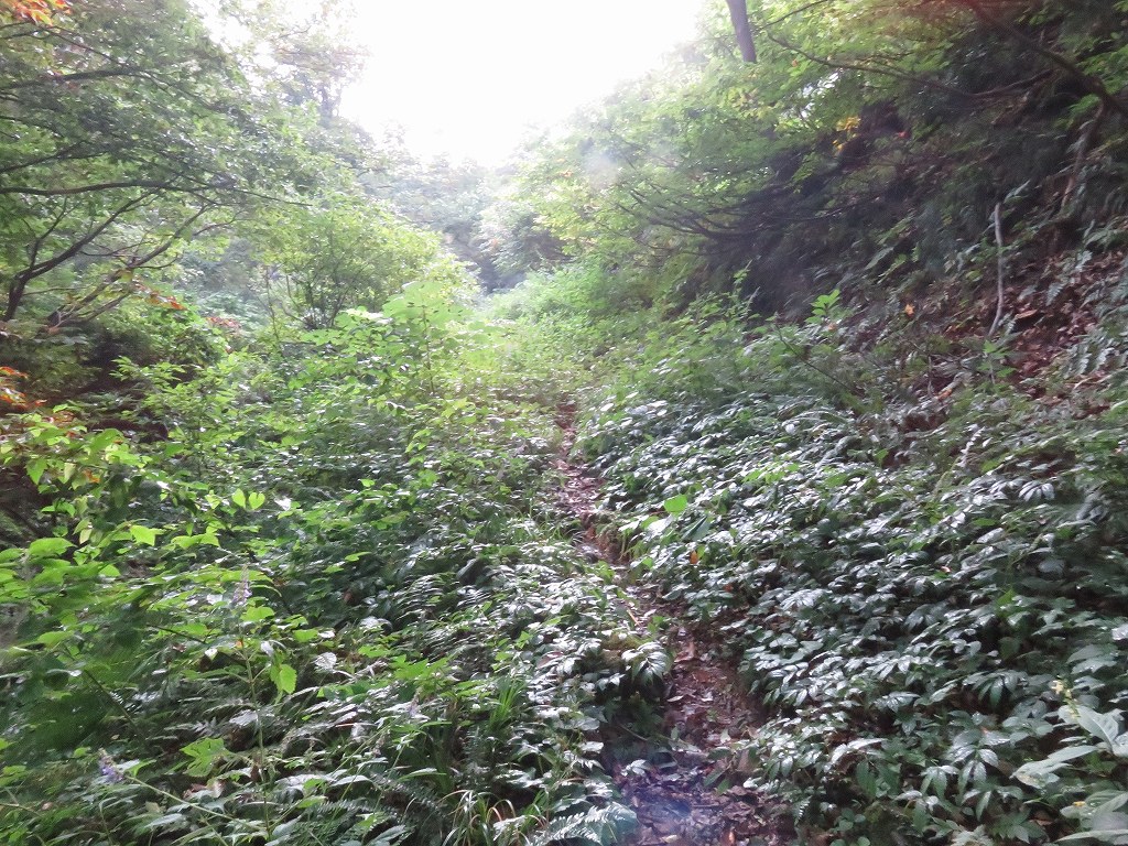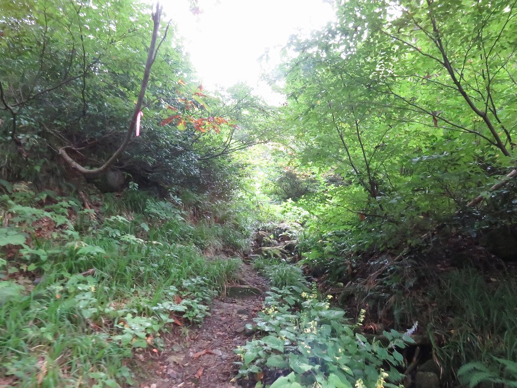 序盤は草に囲まれた細い道や沢沿いの緩やかな登りとなっており、時折沢を越えるところなどもあります。