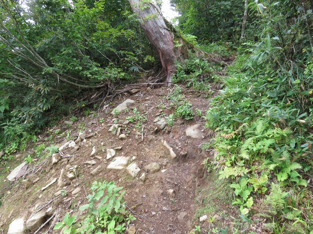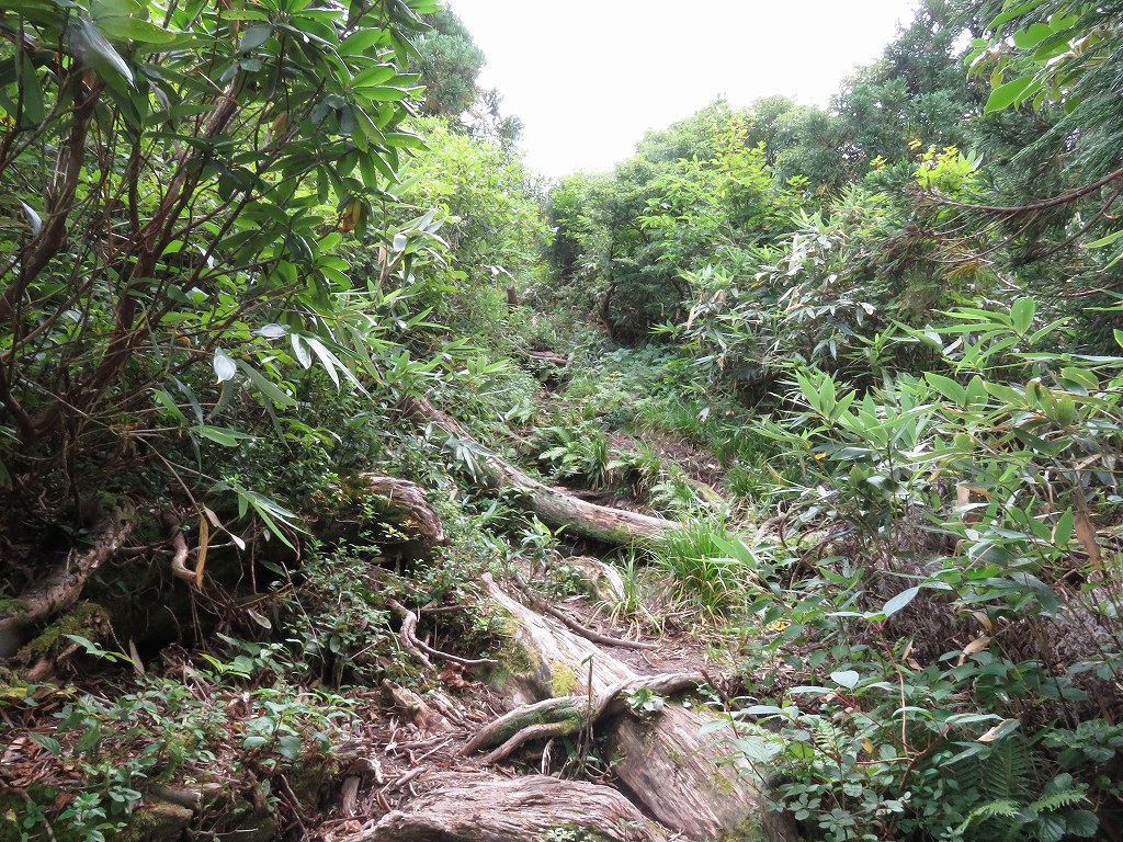 徐々に整備された登山道となり、高い木々の下を登ります。