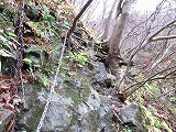 滝を越えると急斜面をジグザグと緩やかに登る箇所が続き、その後の岩場を越えると旧銅山遺構の明神沢立抗(立ち入り禁止)があります。