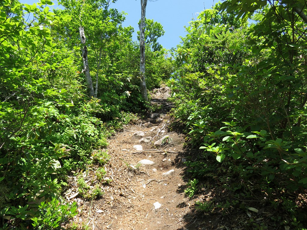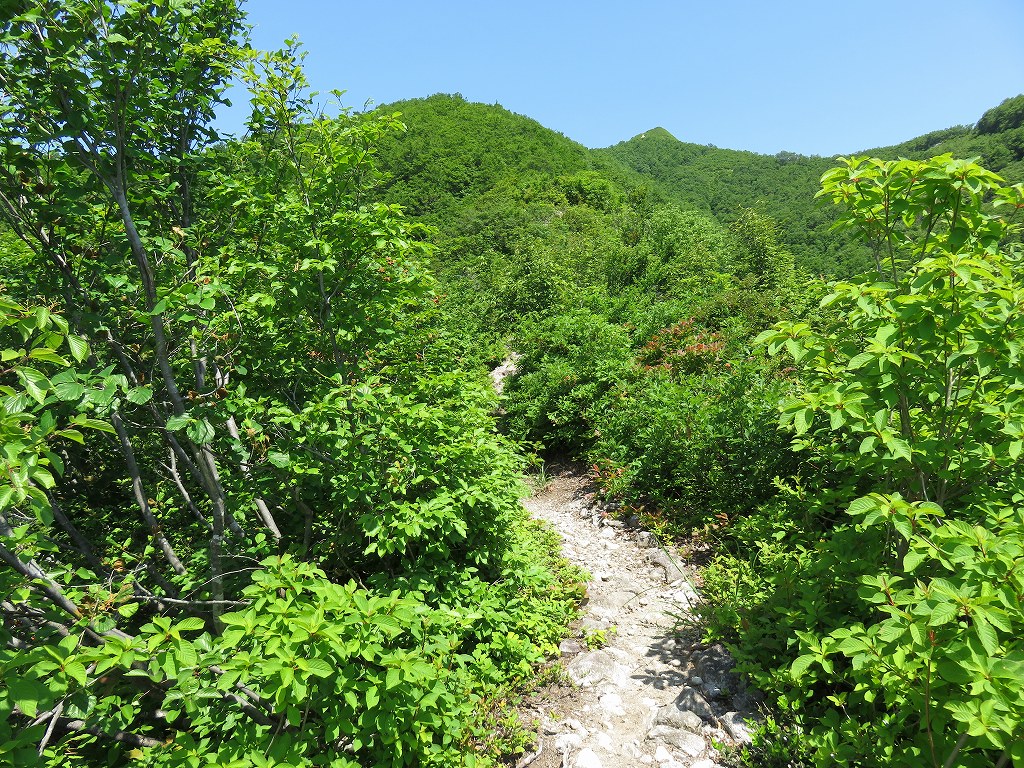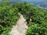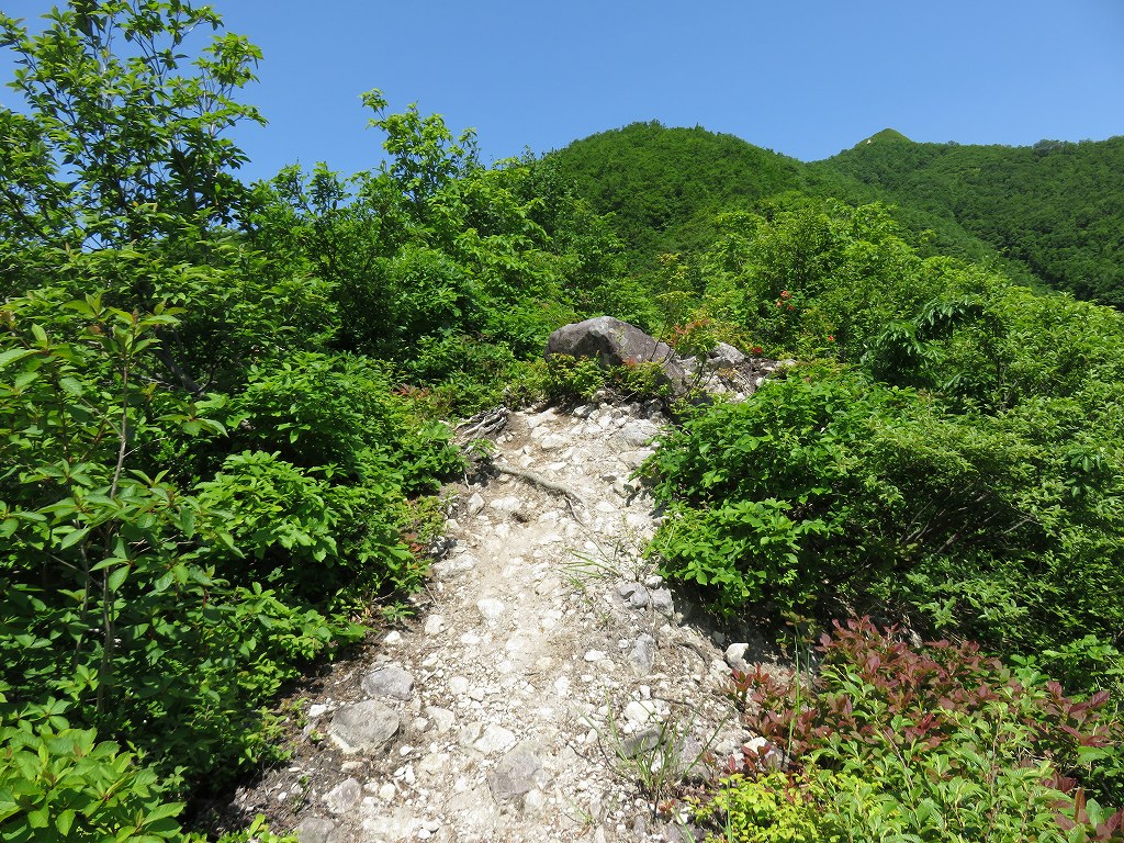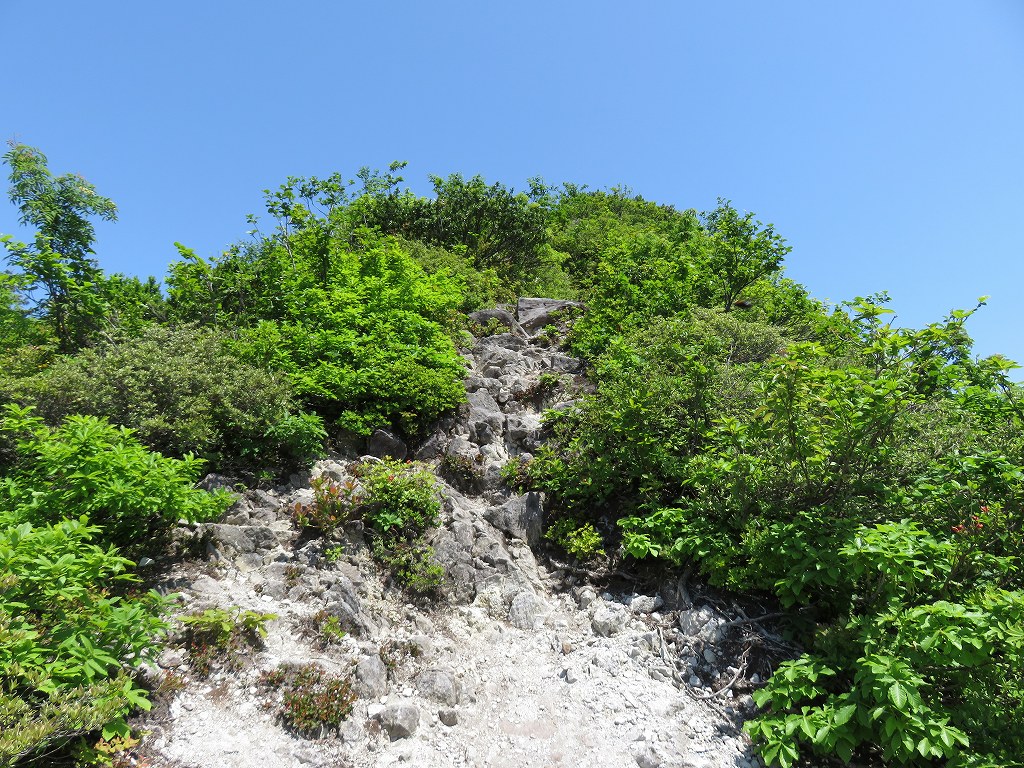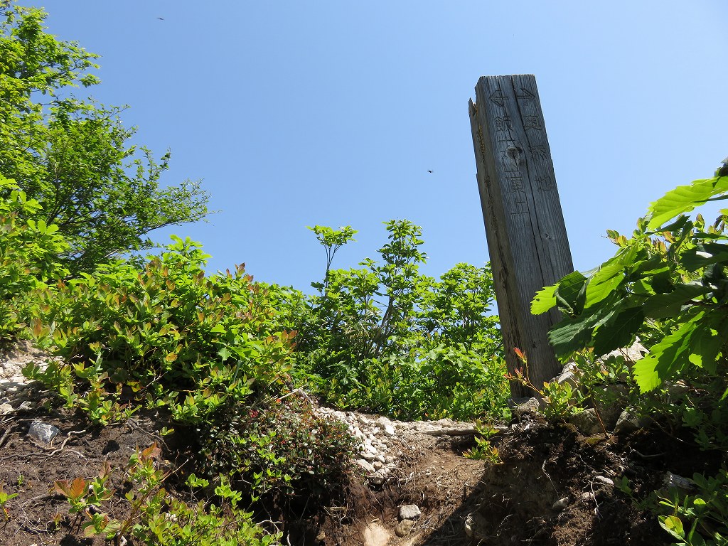 ここを山頂方面へと行くと、再び分岐点(山頂方面と奥添地の分岐)があり、ここを山頂方面に行き、急な岩場を越えると山頂となります。