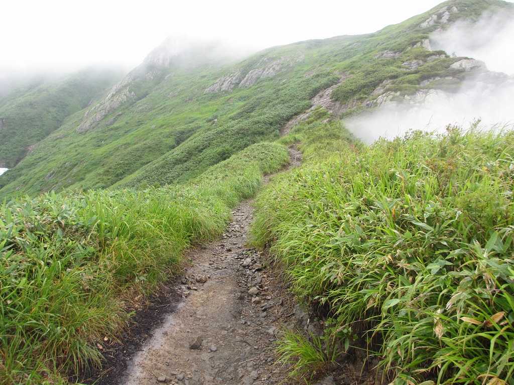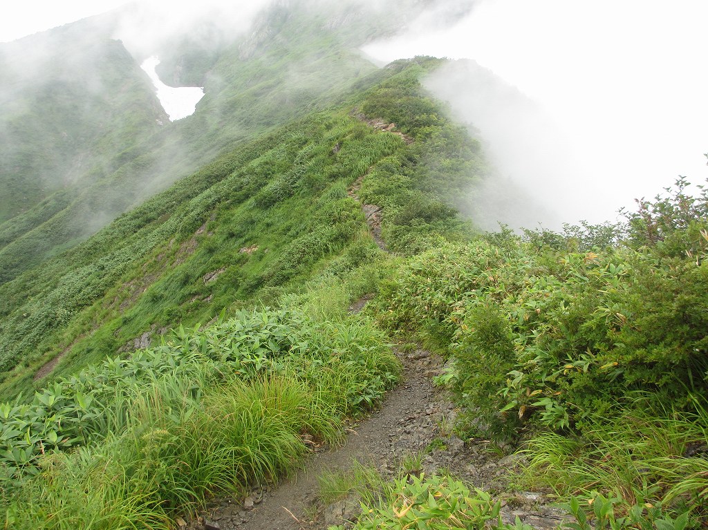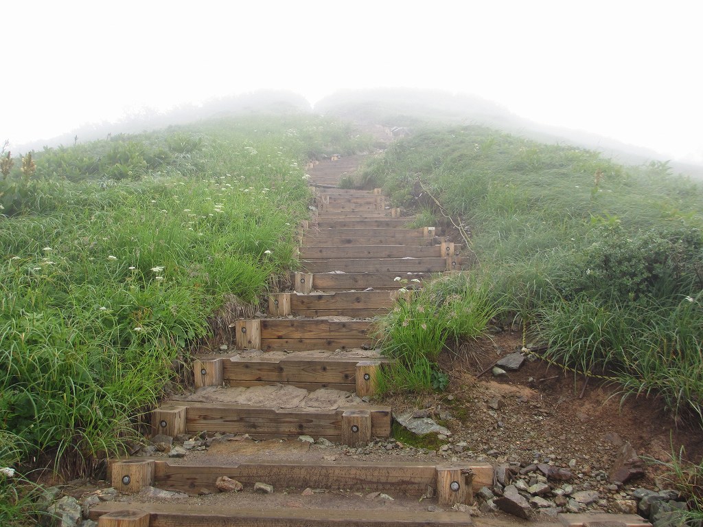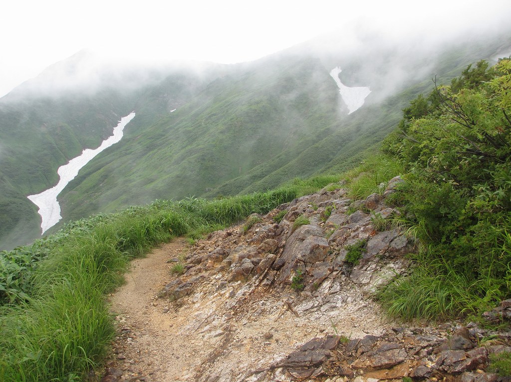 少し登ると左側に銀山平へと下る「銀の道」への分岐点があり、そこからしばらく登ると駒の湯へ向かう「銀の道」への分岐点があります。