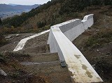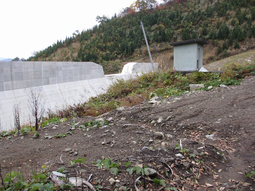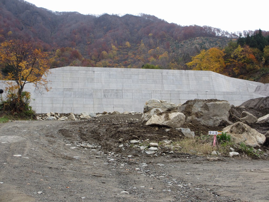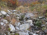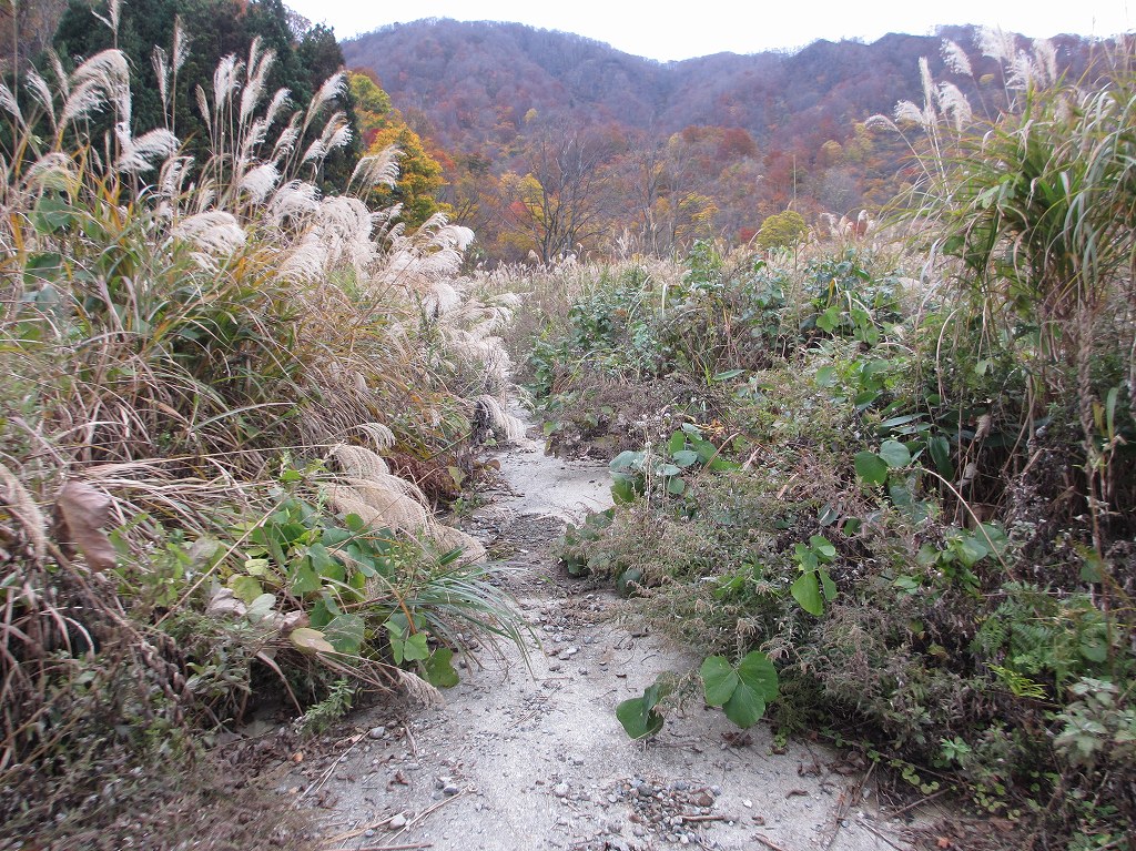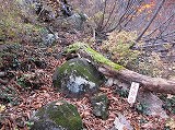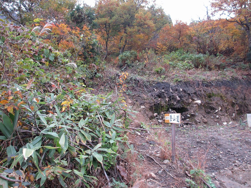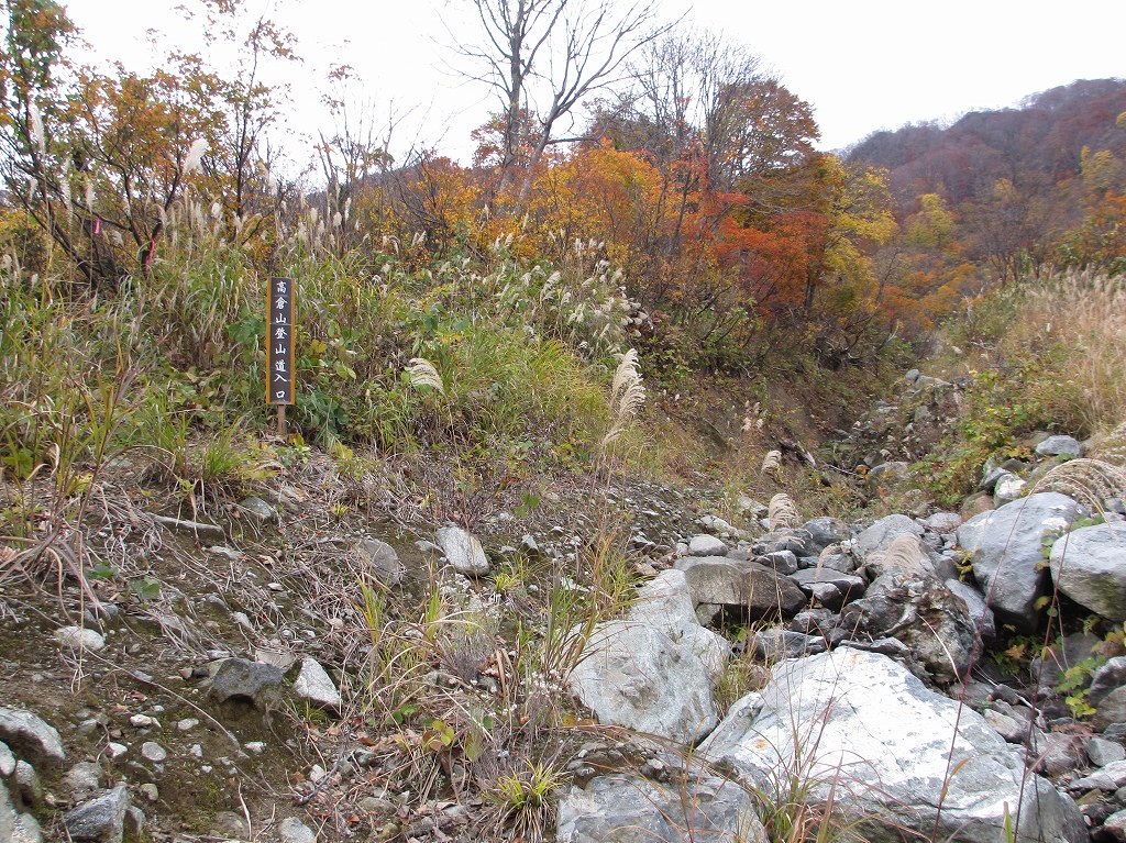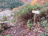 登山口からは、堰堤の右側を抜け、堰堤の裏側に降り、土石流跡の岩場を登ると左側に登山ルートそ示す案内があります。