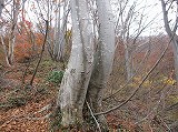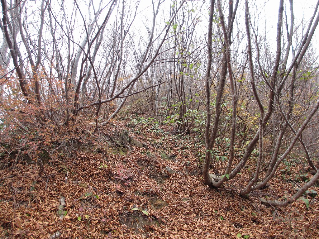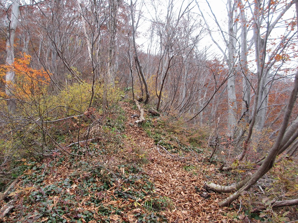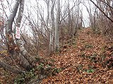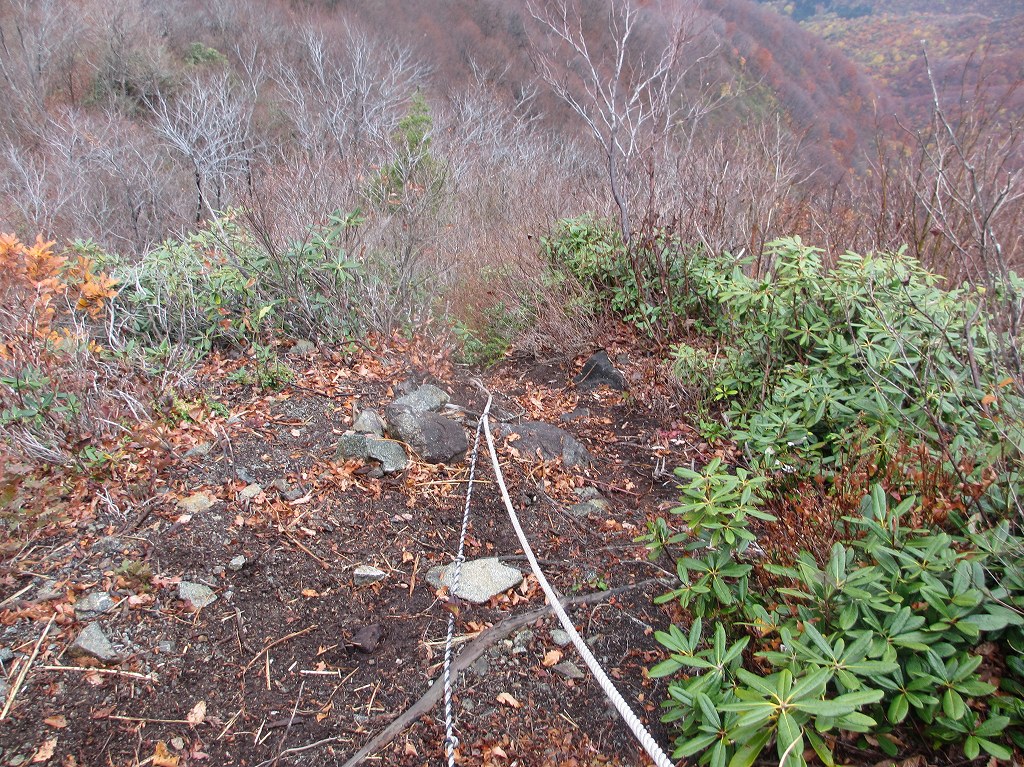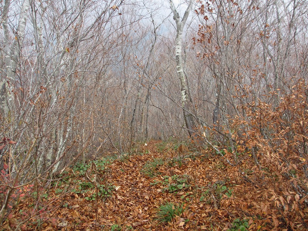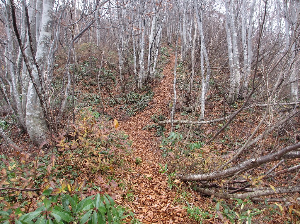 ブナ林に囲まれた緩やかな坂道を登ると、山頂付近が見える様になり、そこからはロープ付きの急斜面や崖などがあるので、足元には細心の注意を払う様にしましょう。